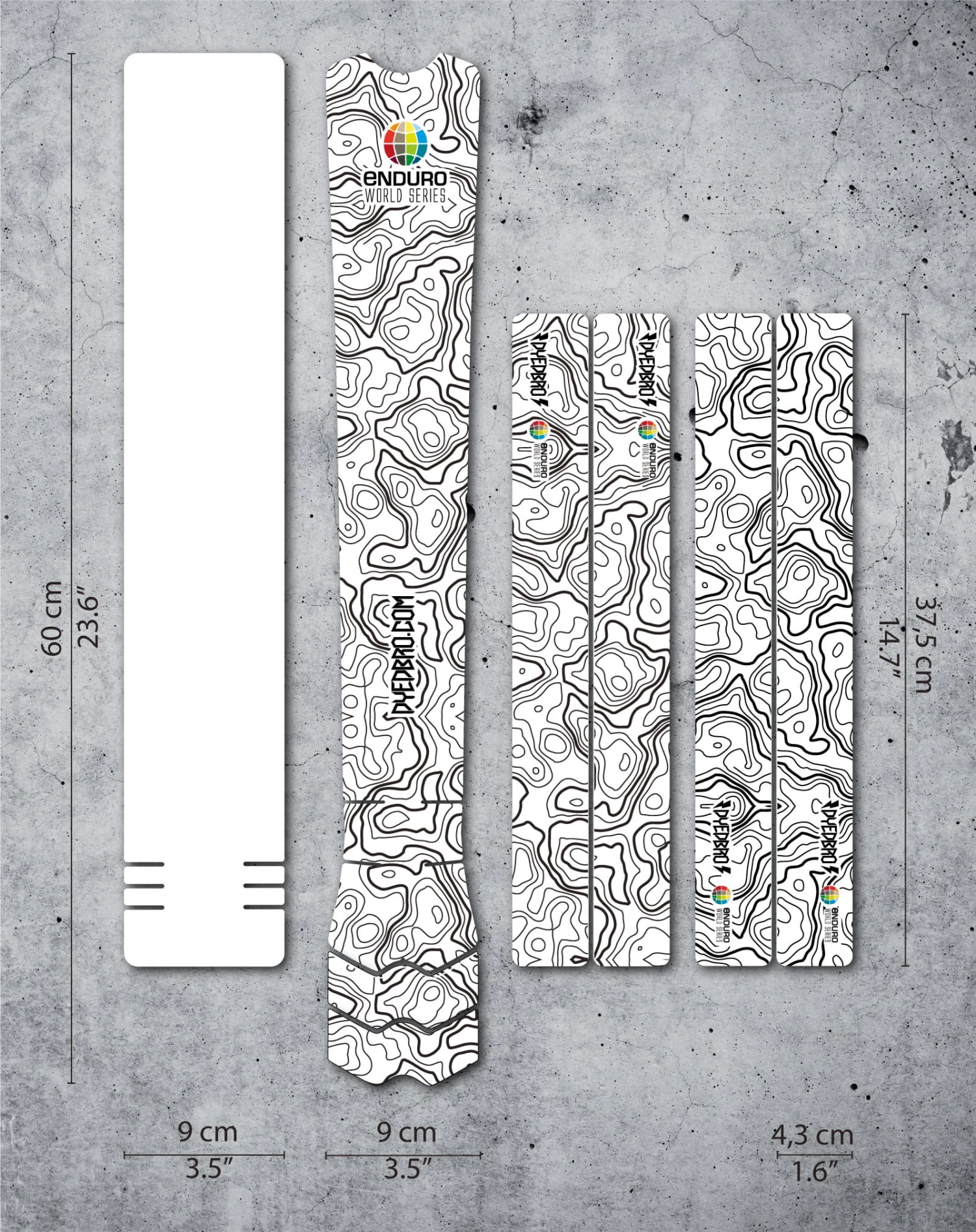 De framebeschermingskit van DyedBro geeft uw fiets een stijlvolle glans en houdt hem effectief vrij van krassen. Het kan worden gebruikt op alle buizen en schoren van het frame. Als gevolg van variaties in de productie, kunnen er kleine verschillen zijn in kleurtint. Dit is de EWS editie, die een uniek topografisch ontwerp heeft met het officiële Enduro World Series logo.